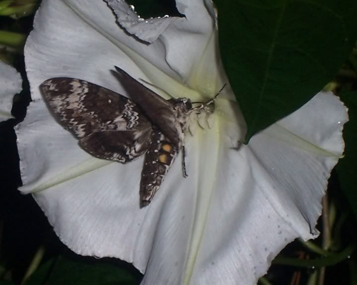 They also make a pretty caterpillar that's colored in shades of green, blue, and purple. I don't have a picture of the caterpillar, which eats members of the madder family, mainly gardenia leaves, but I do have a picture of an adult. They love to nectar at night on moonflowers -
