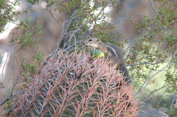 Out where most of you all live , gray squirrels are a problem . Here it is ground squirrels . These squirels are capable of climbing a lot of the cactus here , no small feat . How would you deter those ? Imagine what these guys do to a veggie garden in the desert .