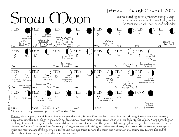 It gives full, quarters and new moons dates for 2003, including February, for the UK.