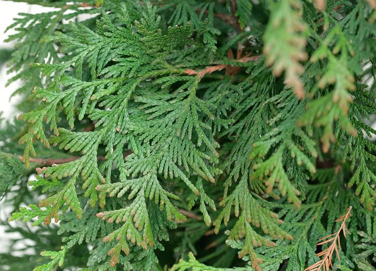 Ok, first up: 'Green Giant' purchased this summer in #15 pots and kept in P.M. shade. I think that is important to note that I can in no way duplicate the conditions that Scott had, nor does my camera saturate the colors the way that his does. My camera doesn't have a flash so I can't add the flash glare that can add some shinyness to the foliage. My best attempt at duplicating with a little glare from the early morning sun. http://i24.photobucket.com/albums/c16/erniew/plants/ThujaXStandishiiGreenGiantFoliage2.jpg