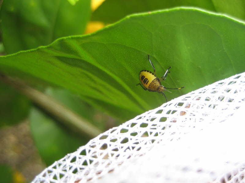 4) < http://i4.photobucket.com/albums/y140/nosface/IMG_2740.jpg >This one confussed me, it looks a lot like a Palomena prasina nymph, but I can't find anything about yellow ones, or stages...? Taken on an orange tree.