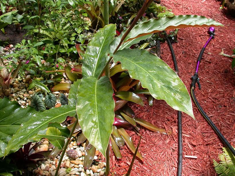 Here is a series of photos. The first is the leaves of fulgens. They are NOT WET. They actually do have this lovely almost iridescent sheen to them. This plant was sold for a while several years ago as Etlingera "heiroglyphics" before it got a species name I guess. So if you see a plant labeled that, its probably fulgens.