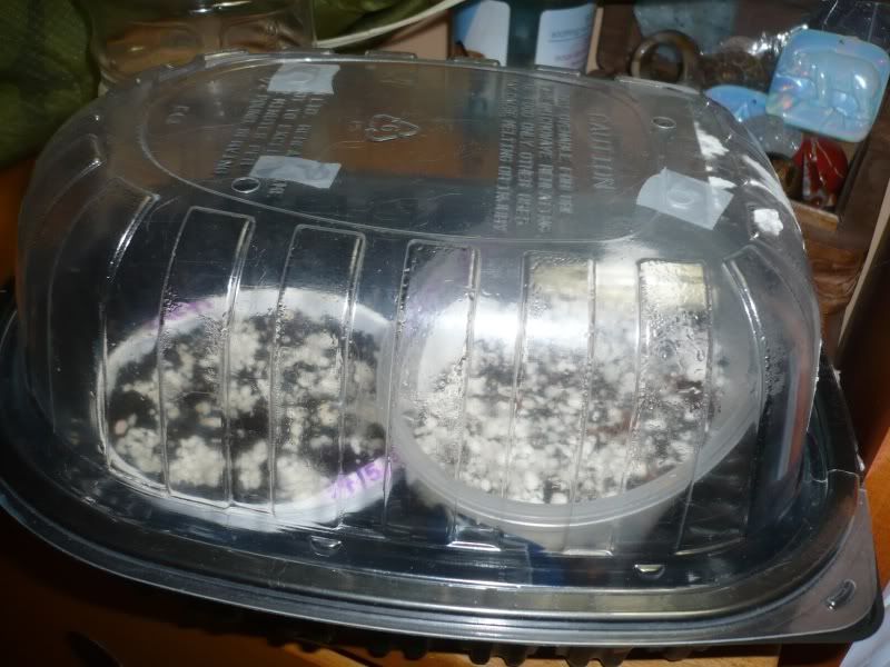 Then they go into my homemade germinator that was cobbled up from a recycled supermarket Roast Chicken container. They have nice clear domes with several holes on top, and dark coloured base which helps absorb the heat.